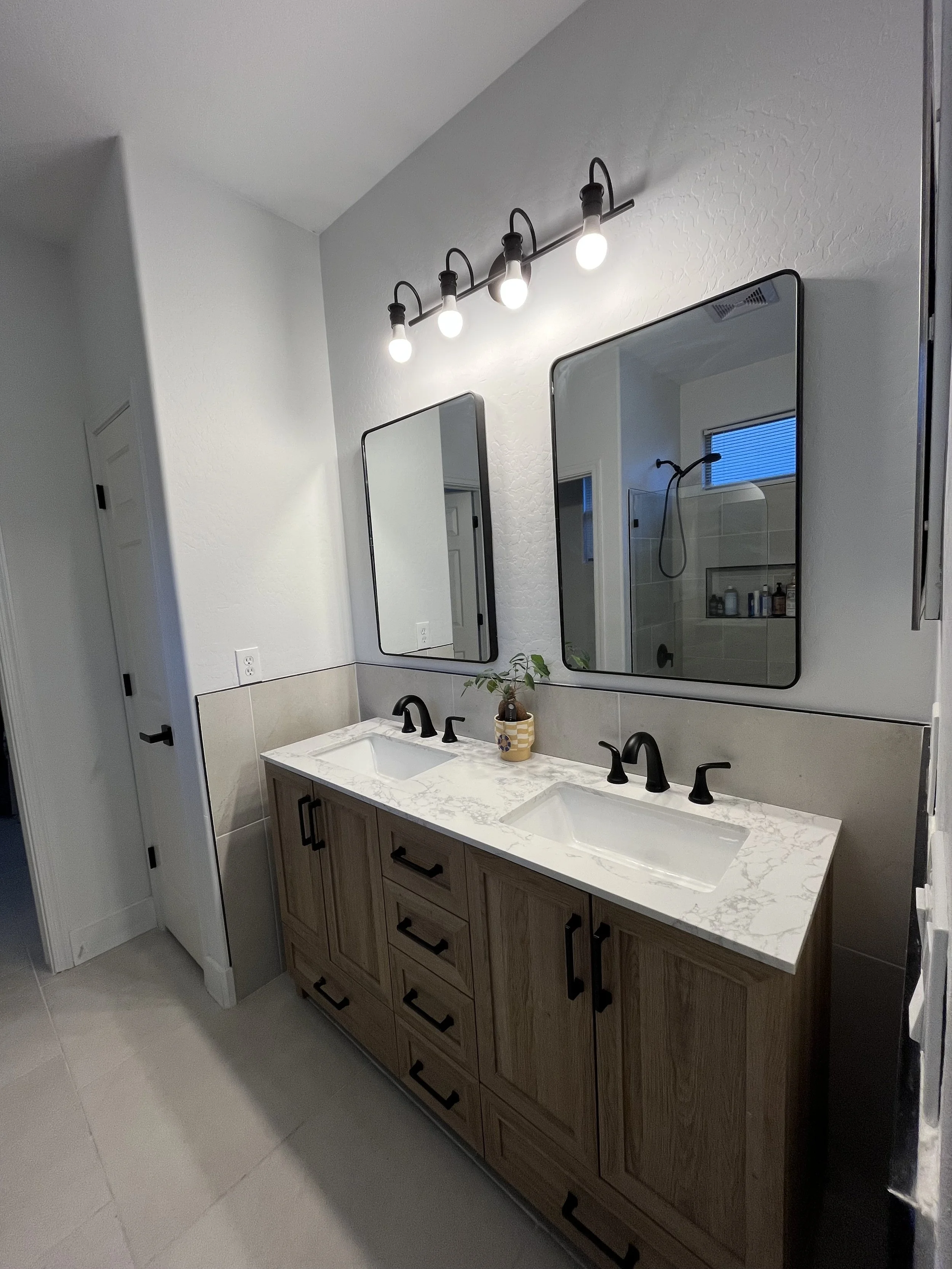 This Anthem project combined two bathroom remodels with broader updates carried throughout the rest of the home. The primary bathroom and guest bathroom were both remodeled, while new flooring, baseboards, paint, appliances, and light fixtures helped create a more cohesive finish throughout the house.
